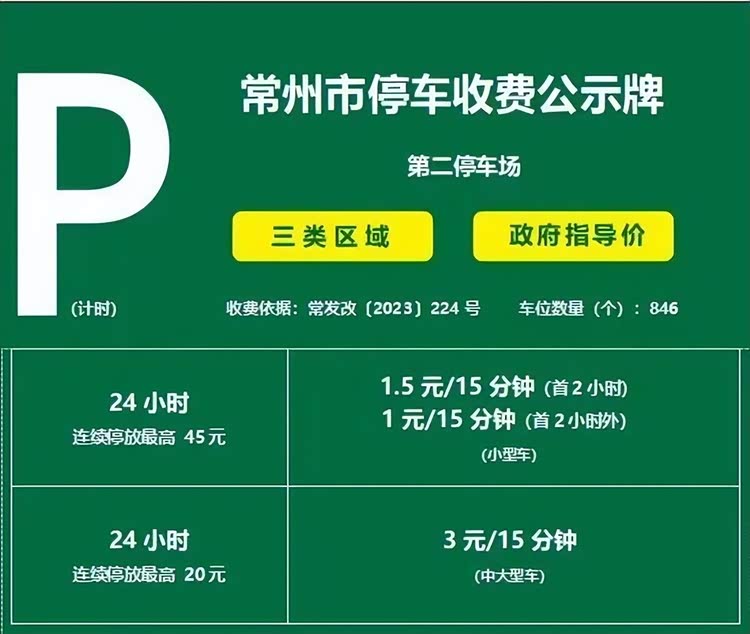 P2 停车场:免费停放 30 分钟;30 分钟至 2 小时内,每 15 分钟收费 1.5 元;超出 2 小时后,每 15 分钟收费 1 元;24 小时最高收费 45 元。