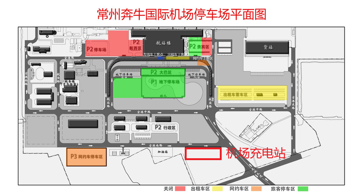P2停车场大巴区:位于候机楼正南方地上,停放大巴及限高2.2米以上车辆;