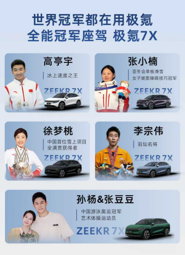 马来西亚羽球传奇李宗伟、冬奥冠军高亭宇、徐梦桃、游泳奥运冠军孙杨与妻子张豆豆、单板滑雪冠军张小楠等,均已成为极氪7X的车主。他们被称为“冠军车主阵容”,其选择背后,是对“六边形战士”级产品力的职业级判断。