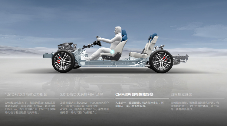 与发动机匹配的爱信8AT变速箱,在平顺性和响应速度上经过多年验证。CMA线控底盘技术则提供了四轮独立悬架、运动负外倾角设计以及大直径防倾稳定杆。这套底盘配置,保证了激烈驾驶时的支撑性,日常通勤又能过滤掉大部分细碎震动。运动与舒适的平衡,一直是CMA架构的强项,星瑞全新东方曜延续了这一特质。