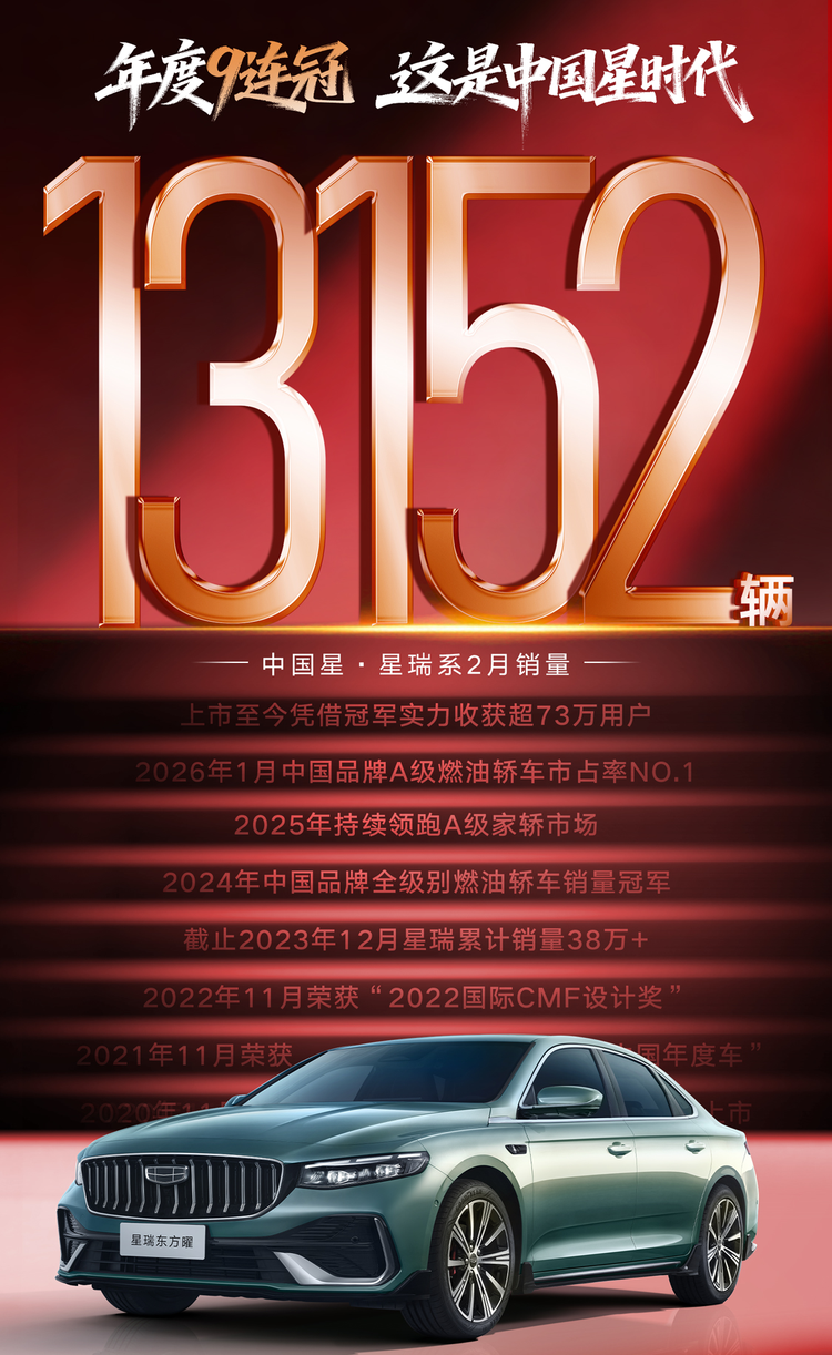从74万到下一个74万,星瑞全新东方曜靠的是持续进化的产品力。设计有辨识度、智能跟得上节奏、动力够强劲、安全有保障,再加上诚意的价格和权益,这样的产品,自然能继续打动消费者。2月13152辆的销量,就是最好的证明。