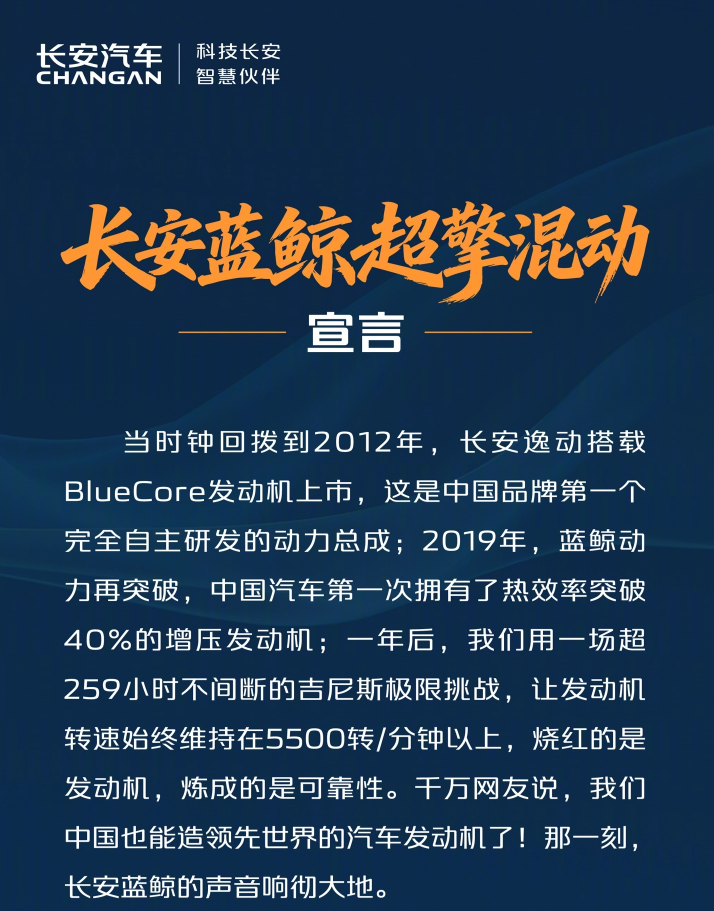 长安发布“蓝鲸超擎”混动技术:城区工况百公里油耗低至2.98升