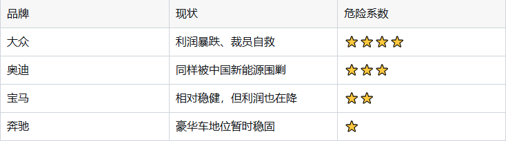 核心问题不是"德系车不行",而是燃油车的红利正在消失 — 合资品牌过去30年靠油车躺赢,现在新能源来了,游戏规则变了,中国品牌真的起来了,不只是性价比,技术、体验、智能化全面超越,转型太慢 = 等死 — 大众的电动化进程,至少比比亚迪慢了3-5年。