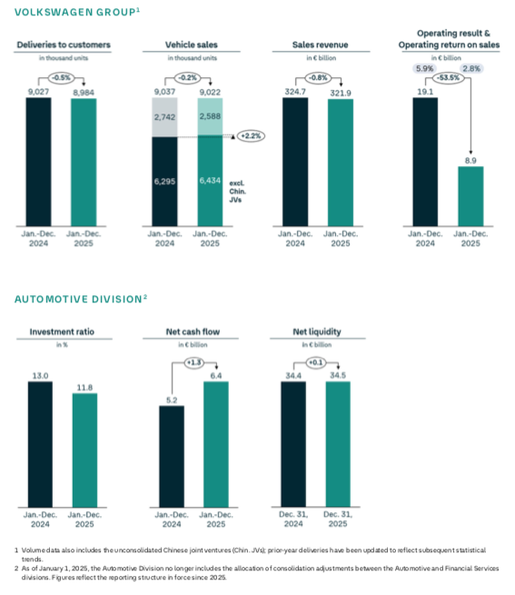 3月10日,大众集团公布2025年全年财报。所有数据都在下跌:营业利润:88.68亿欧元,同比暴跌53.5%,税后净利润:69亿欧元,同比下降44%,营收:3219.13亿欧元,同比微降0.8%,这是什么概念?2016年以来最差!