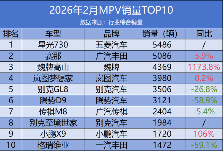 魏牌高山凭借4369辆销量跻身第三,同比暴涨1173.8%,高端定位、智能配置与新能源动力优势,快速抢占高端家用MPV市场;岚图梦想家以3980辆位列第四,依托混动、纯电双动力布局,兼顾实用性与新能源属性,维持了稳定的市场表现;小鹏X9以1720辆位列第九,同比大涨106%,凭借年轻化设计、智能座舱与大空间优势,成为新势力MPV的潜力选手。