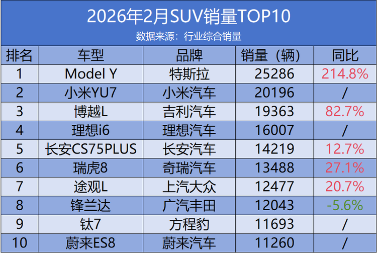 2月车市处于传统淡季,国内SUV市场格局清晰显现:新能源车型稳居头部,新势力车企强势突围,传统燃油品牌固守细分赛道,在电动化转型浪潮下,市场竞争更趋理性,各大车企均依托产品实力争夺市场份额。