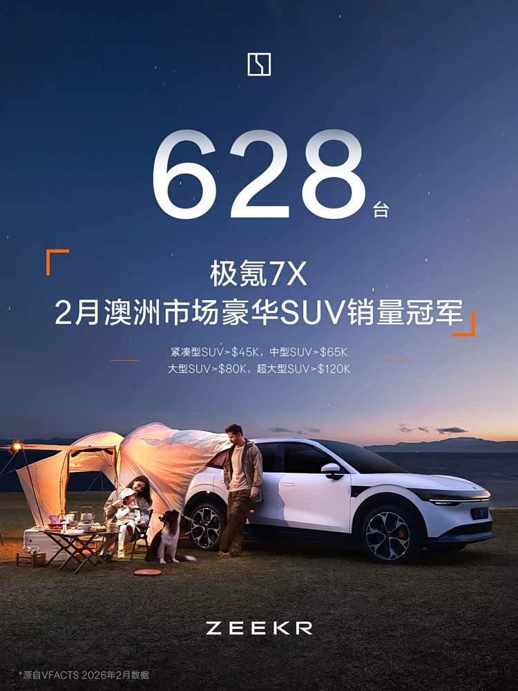 而在澳洲市场,极氪7X也是成功征服当地用户。车辆出色的通过性,无论是澳洲的乡间小路还是非铺装路面,都能轻松应对;大尺寸后备箱空间搭配外放电功能,完美适配澳洲流行的户外露营、长途自驾生活方式,让用户在远离城市的自然中也能享受便捷用电体验;同时,极氪7X的安全性能也经过严苛验证,为澳洲用户的户外出行保驾护航。正是这种精准契合当地生活场景的产品优势,让极氪7X在2月单月便以628台的销量超越BBA等传统豪华品牌,登顶澳洲豪华SUV销量榜首,成为当地用户眼中的全能出行伙伴。