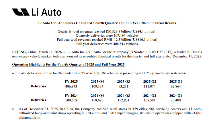 车家号·0浏览·2026-03-12 19:08 · 北京PChome 3月12日消息,理想汽车正式发布2025年第四季度及全年未经审计财务报告。公司全年交付40.63万辆,营收1123亿元,净利润11亿元,成为国内唯一连续三年营收破千亿、连续三年盈利的新势力车企。