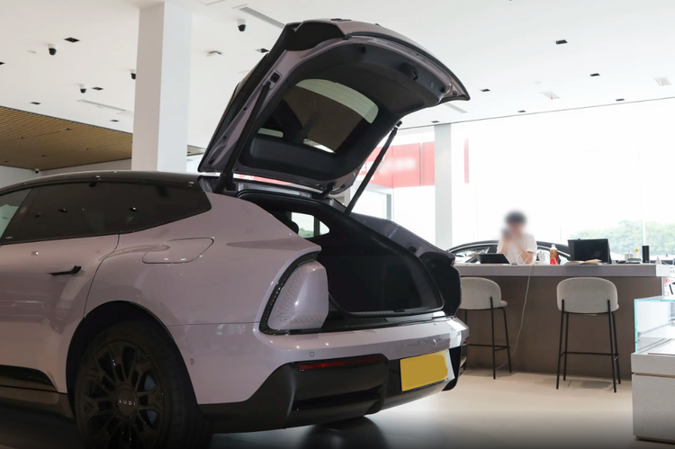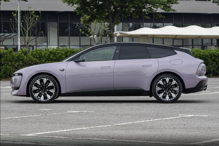 侧面造型流畅修长,前后轮拱突出车身表面带来强烈的力量感,悬浮式车顶与下方黑色侧裙线的组合,则有效降低了视觉厚度,浅色车身下效果尤为明显。并且还配备了电子外后视镜以及隐藏式门把手设计。此外,溜背式车顶在尾部逐渐收紧,与外扩的后轮拱相呼应,营造出低重心且稳健的视觉效果,后挡风中央的摄像头加上面积不大的后风挡,会给驾驶员带来一定的视野盲区。