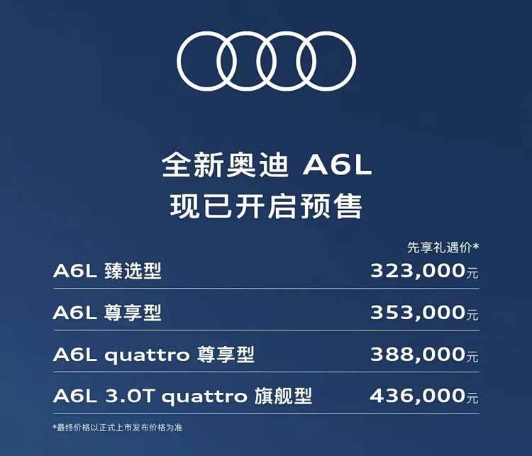 谁也没有想到,全新奥迪A6L的预售价会将起售价拉低10万。3月10日,一汽奥迪官方宣布全新奥迪A6L正式开启预售,此次预售共推出4款车型,先享礼遇价区间为32.3万-43.6万元,预计3月内正式上市。其32.3万元的起售价较老款(2025款)42.79万元的官方起售价直降10.49万元,引发热议。目测,该车最终售价会在30万起步,与Q5L保持同等水平。
