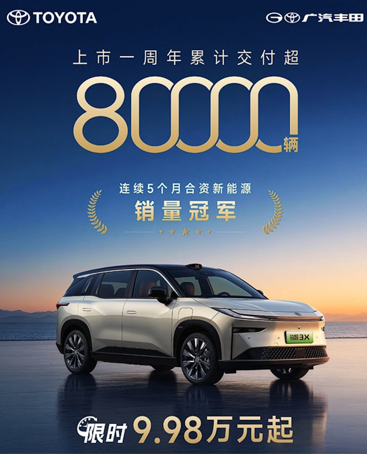 最近广汽丰田发了个自家的“成绩单”, 旗下紧凑型纯电SUV 铂智3X(参数|询价)上市一周年累计交付超过80000辆,连续5个月蝉联合资新能源销冠。合资+纯电,这两个词组合起来竟然卖了这么多?