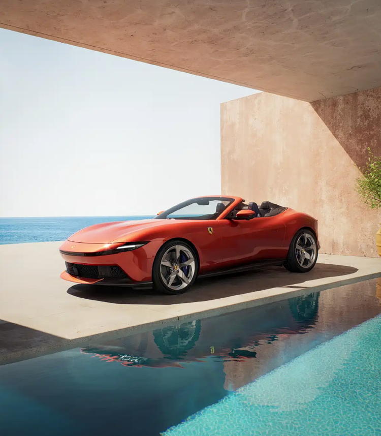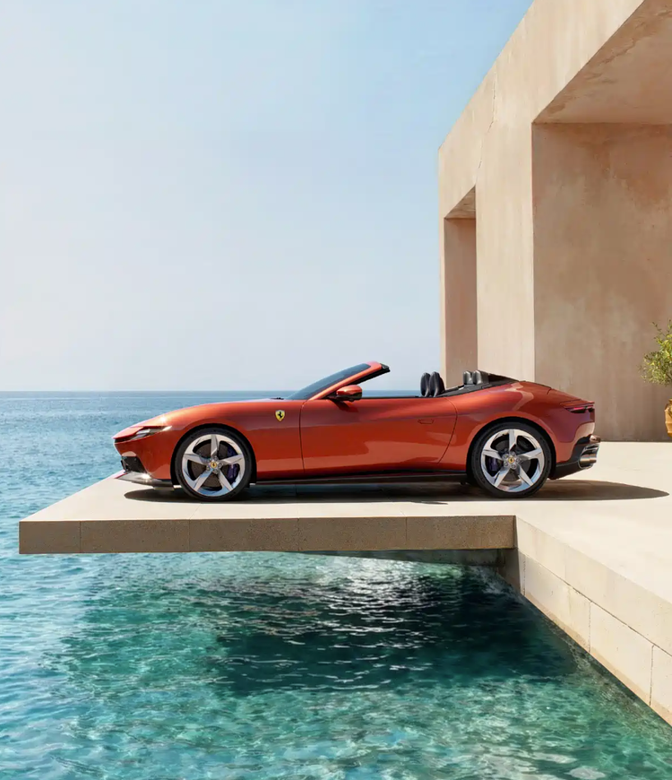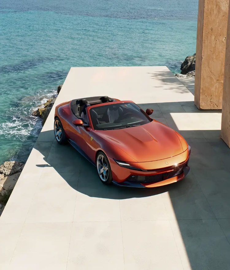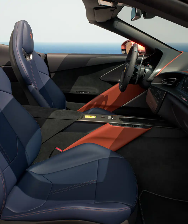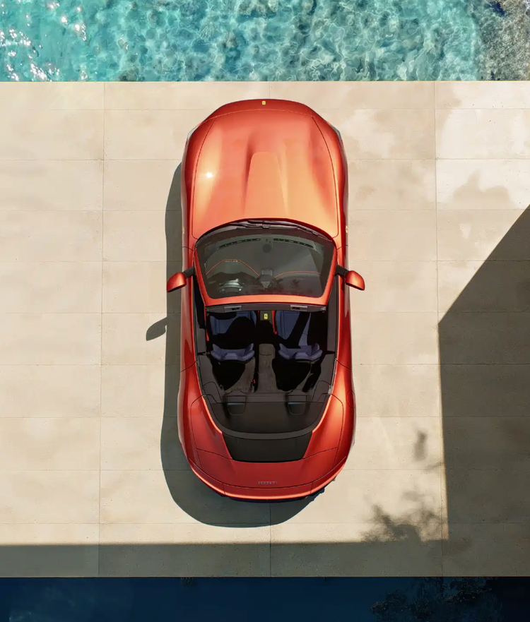 中控台设有10.25英寸触控屏,通道区域配备复古风格金属换挡拨杆,并设有法拉利长方形车钥匙专属安置槽。副驾驶同样采用环抱式座舱设计,配备8.8英寸信息显示屏,可共享车辆行驶状态。新车延续2+2座椅布局,虽后排空间有限,但完整传承了敞篷GT跑车的经典形态。