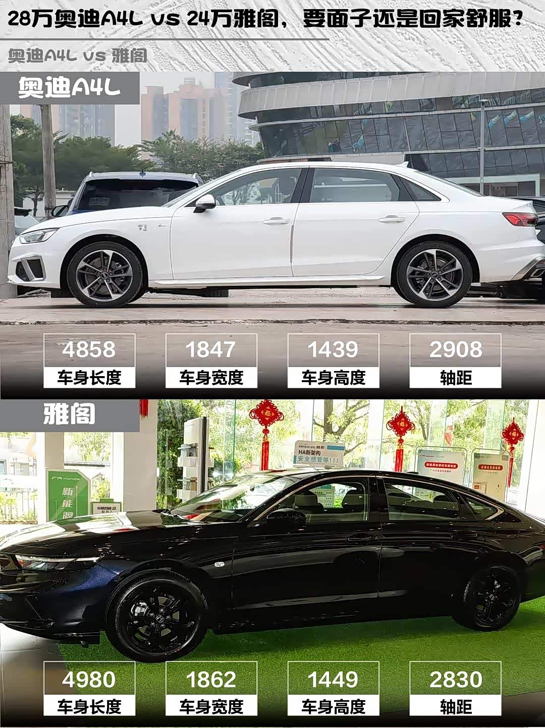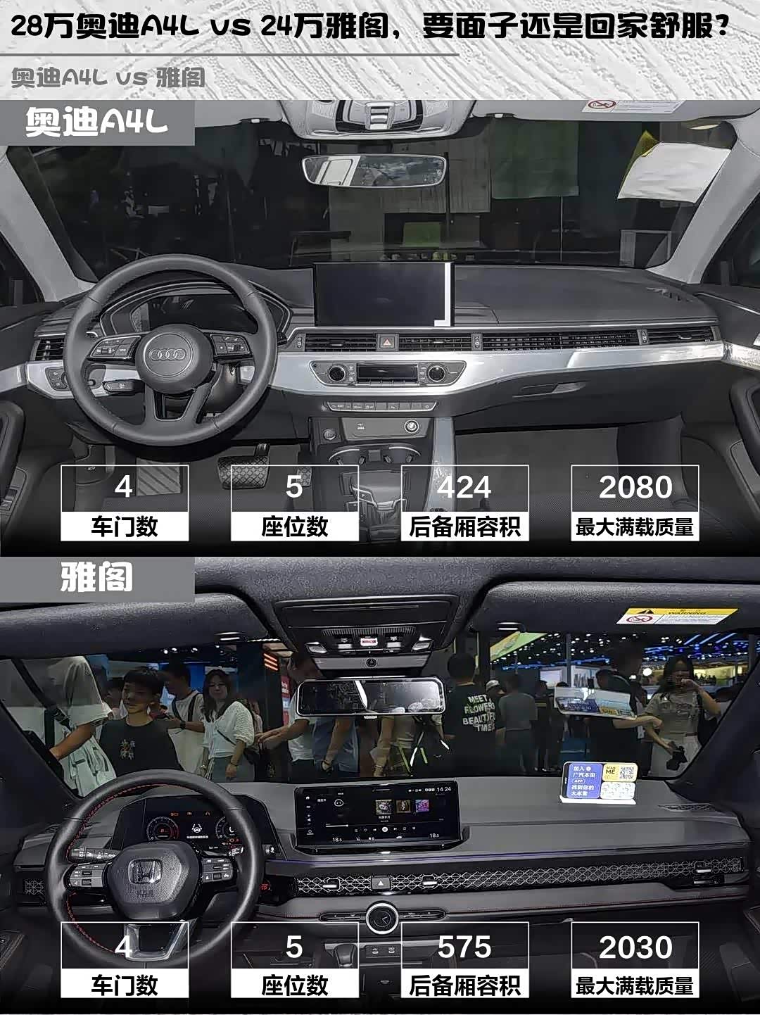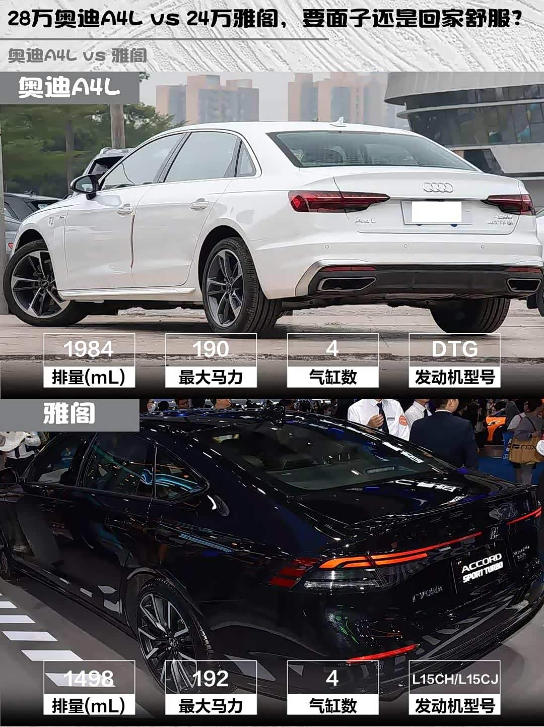 要品牌调性+驾驶质感选A4L,40TFSI动力完全够用,记得选装自适应巡航;更看重家用属性就选雅阁,L2辅助驾驶+大空间对家庭用户更友好。两台车性格差异明显,建议都去试驾再决定!
