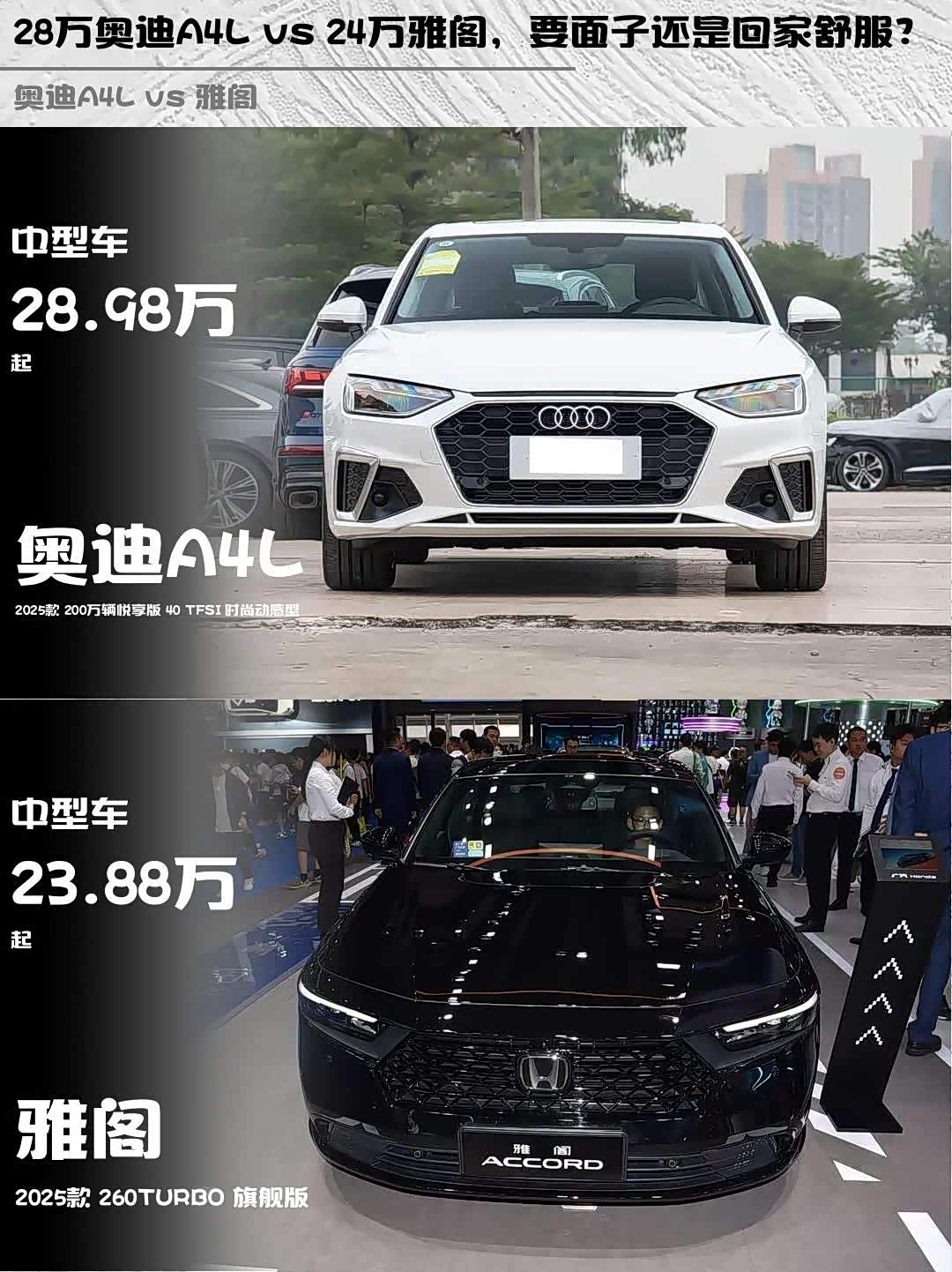 最近在纠结 奥迪A4L(参数|询价) 2025款 200万辆悦享版 40 TFSI 时尚动感型和雅阁 2025款 260TURBO 旗舰版的朋友看过来!作为深度体验过两台车的车主,掏心窝子分享真实对比感受👇