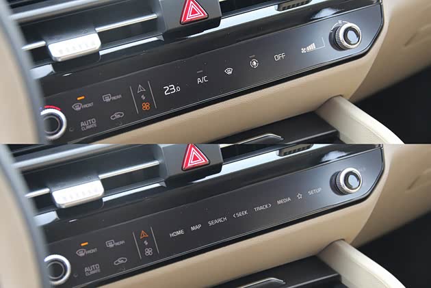 中控屏下方则是空调和车机主要功能的触控面板,而且两个页面可以进行互换,与之对应的两端实物旋钮也会切换不同的功能。对于这个东西,笔者个人持保留意见,从积极的方面来说,把这些主要功能从中控屏里单独拎出来确实可以减少对屏幕的占用,但另一方面,要想控制这些功能依然需要触控的方式,不仅需要精准点击且没有触感上的主动回馈,这对于行驶中更安全的盲操作方式是背道而驰的,说实话我宁愿用两排实体按钮来取代,加钱我都愿意,您觉得呢?