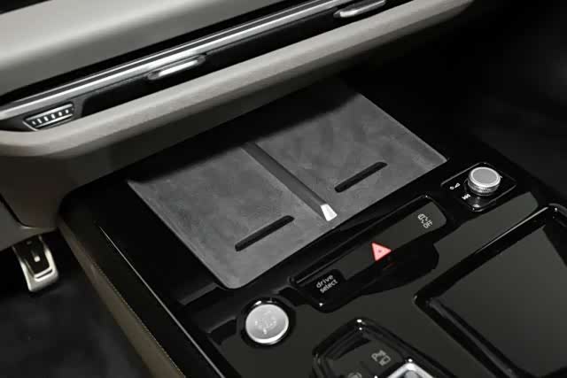 中央扶手区域前端为两块无线充电面板,后方为启动按钮、双闪、音量控制旋钮等车控按键。后方为电子换挡区域和两个杯架以及中央扶手箱。