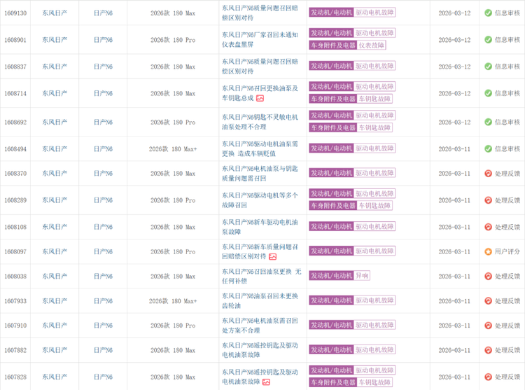 提车三个月召回四次,钥匙失灵、电机油泵召回、车机黑屏、强制保电失效……多位东风 日产N6(参数|询价)车主近日集体向第三方投诉平台车质网投诉,表达了对这款车型质量的强烈不满。