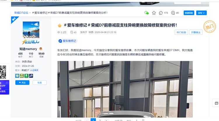 记者了解到,赵女士和刘先生遇到的减震异响问题并非个例。在汽车交流平台上,有大量荣威D7车主反馈同款问题,其中不乏2023款和2025款车型的车主,异响部位多集中在前悬挂减震器,症状与赵女士、刘先生描述的高度相似。