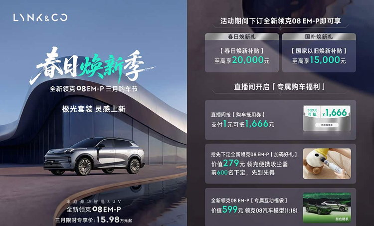 3月13日,领克品牌为旗下两款插电式混合动力车型增添了新的选择, 领克07 EM-P(参数|询价)新增了一款配置,名为126长续航Ultra碳纤维尾翼版,官方售价为17.58万元。与此同时,领克08 EM-P则推出了名为“极光”的特别套装,在3月期间,这个套装的起始价格为15.98万元。针对此次更新,官方也提供了相应的购车方案。