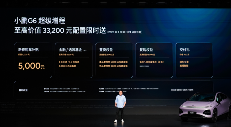 近日,小鹏汽车举行 小鹏G6(参数|询价)超级增程上市发布会,新车定位六项全能AI增程SUV,以“六项全能 一步到位”为核心,凭借同级综合续航第一、同级补能速度第一、同级车端有效算力第一、同级最强底盘系统、同级最强主动安全和同级得房率第一的六大核心优势,打造真正满足用户全场景需求的国民车。本次发布小鹏G6超级增程1704 Max,官方指导价为18.68万元,用户可选装两个智能升级包,加购12,000元升级为Ultra SE版本、加购20,000元升级为Ultra版本。即日起至2026年3月31日24点前下定小鹏G6超级增程,可享至高价值33,200元限时权益礼包,包括5,000元新春购车补贴、至高价值9,300元金融/选装基金(二选一)、至高价值5,000元置换权益、至高价值13,500元复购权益和价值400元交付礼。