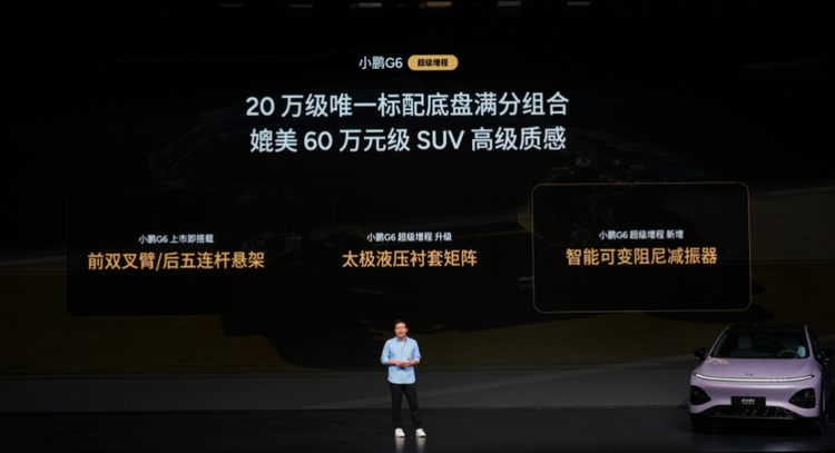 小鹏G6底盘立足用户需求持续进化,从最初专注单人运动操控,全面升级为满足一家人的驾乘舒适。此次,小鹏G6超级增程全系标配太极AI底盘,同级唯一标配前双叉臂/后五连杆独立悬架+太极液压衬套矩阵+智能可变阻尼减振器,以20万级唯一标配底盘满分组合,拥有媲美60万级SUV的高级质感,让每位驾乘者都能拥有良好的体验。新车还拥有行业领先的5项AI底盘能力,拥有感知广、执行快、可迭代的优势,可实现最远提前200m识别、最大提前300ms调节,并具备超强自学习能力,最快21天可迭代一个新功能,轻松应对城市、乡村、高速等多种路况,适配家庭全场景的驾乘需求。