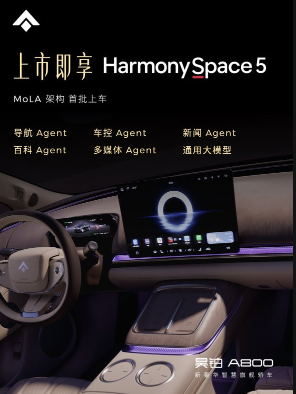 在智能座舱方面,昊铂A800同样带来了领先同级的数字化体验。其搭载的鸿蒙座舱 Harmony Space 5基于MoLA架构打造,整合了五大Agent智能体与通用大模型能力。在大模型技术的加持下,车辆座舱不仅能够实现导航纠错、模糊语义控车、多媒体智能搜索等智能功能,还支持更加自然的情感化交互,让人车沟通更加流畅与直观。