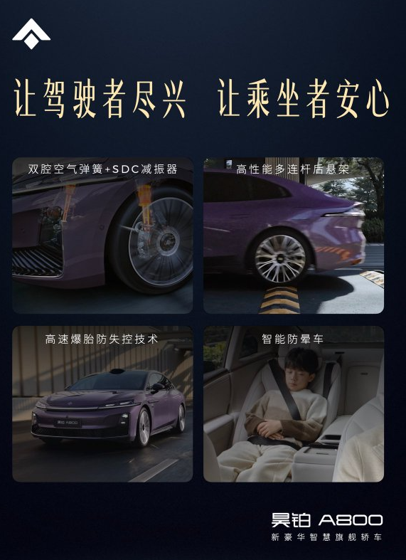 此外,新车还配备了高性能多连杆后悬架结构、高速爆胎防失控技术以及智能防晕车系统等多项先进技术。通过对安全性能与新能源用户常见使用痛点的系统化优化,昊铂A800不仅在日常驾驶中提供更加安心舒适的体验,在面对极限驾驶场景时同样能够保持稳定可靠的表现。结合广汽昊铂多年来在底盘调校方面积累的深厚经验,这套智慧数字底盘也进一步释放了整车的动态潜力,让昊铂A800在性能与舒适之间实现了更加均衡的表现。