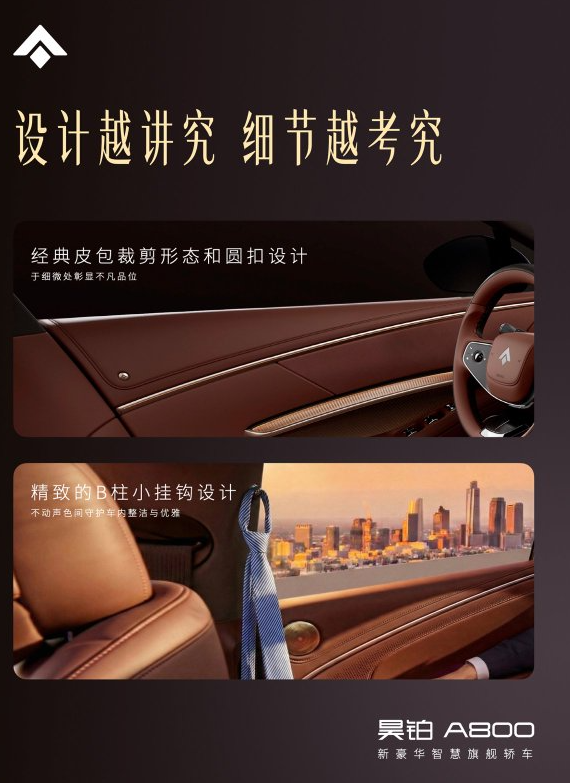 进入车内,昊铂A800在内饰设计上同样强调创新与舒适并重。整车采用“前后双环抱”式设计布局,既保证驾驶者的操控沉浸感,也为后排乘客营造出更加舒适的乘坐氛围。车内配备长达6536毫米的月晕氛围灯带,在不同场景下可呈现出层次丰富的光影效果,营造出沉浸式座舱体验。在用料与质感方面,昊铂A800同样体现出旗舰级水准。车内采用30年花曲柳木饰板搭配超柔Nappa真皮,将东方审美的温润质感与现代科技氛围巧妙融合,使座舱既具豪华质感,又不失优雅格调。