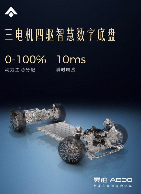在核心底盘技术方面,昊铂A800的三电机四驱系统不仅可以主动调节左右车轮之间的动力分配,还能够对前后轴动力输出进行智能控制。由于整个动力分配过程完全依靠电控系统实现,无需传统机械结构参与,系统最快仅需10毫秒即可完成单个车轮从0到100%动力输出的调节,从而带来更加迅速且精准的动态响应。