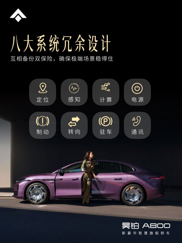 为了确保高阶智能驾驶系统在各种复杂场景下依然能够稳定运行,昊铂A800在整车架构层面也进行了系统级强化设计。车辆在定位、感知、计算、电源、制动、转向、驻车以及通讯等八大关键系统上均采用了冗余设计,为智能驾驶的安全运行构建起更加稳固的技术底座。