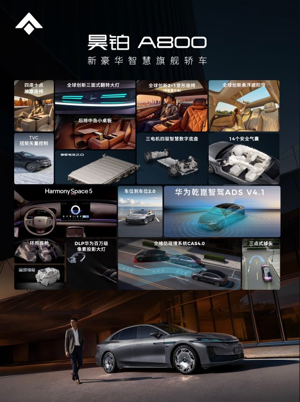 作为一款定位中大型新能源旗舰轿车的车型,昊铂A800在技术与配置层面实现了多项突破。新车搭载三电机四驱智慧数字底盘,在动力性能与操控稳定性方面拥有出色表现;同时配备行业领先的华为乾崑智驾 ADS 4.1系统以及鸿蒙座舱 HarmonySpace 5,在智能驾驶辅助、人车交互以及数字化体验方面全面升级,使整车在操控性能、乘坐舒适性与智能科技等多个维度都达到了新的高度。