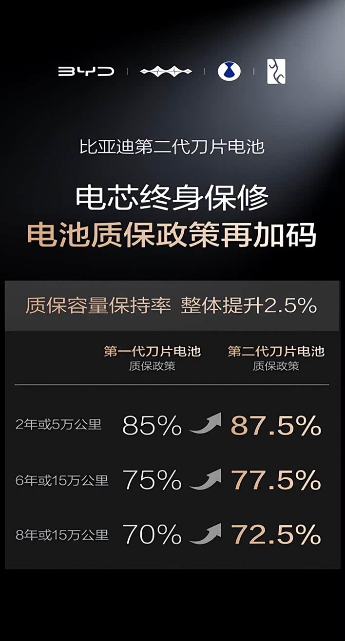 依托于技术带来的产品底气,比亚迪第二代刀片电池将质保政策全面加码,为用户送上安心保障。相较于第一代刀片电池,第二代产品将质保的「容量保持率」整体提升2.5%,在6年或15万公里质保期内,电池容量低于77.5%即可享受免费包换服务;同时,电芯更是提供「终身保修」权益,以行业领先的质保标准,打消用户的用车顾虑。