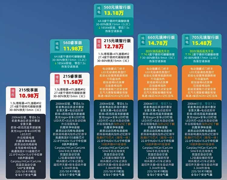 纯电版车型之间的配置差异集中在电池、辅助驾驶功能。除了入门版车型外,其余纯电版车型都配备有智能辅助驾驶功能,并且根据电池续航、电机功率大小分为四种选择。其中,660km版本与705km版本搭载800V高压碳化硅平台,匹配宁德时代神行超充电池,支持5C快充,30%—80% 充电仅需 8.9 分钟。