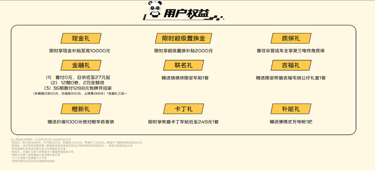现在入手熊猫卡丁门槛超低,首付0元日供低至27元起,12期0息、36期首付1288元包牌开回家,多种金融方案任你选。首任非营运车主还享三电终身质保,下定就送便携式充电枪,后续用车全程无忧,4万多就能拥有一台智能又实用的通勤座驾,熊猫卡丁绝对是年轻人的优选。