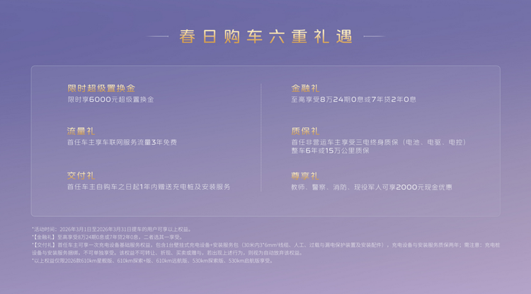在2026年3月1日至3月31日期间提车的用户,除了3年免费流量这一贴心福利,还能享受限定六重礼遇:限时6000元超级置换金,至高6400元的金融补贴(支持8万24期0息),首任非营运车主可享三电终身质保及整车6年或15万公里质保,自购车之日起1年内还能获赠充电桩及安装服务,教师、警察、消防现役军人等群体更可享受2000元现金优惠。