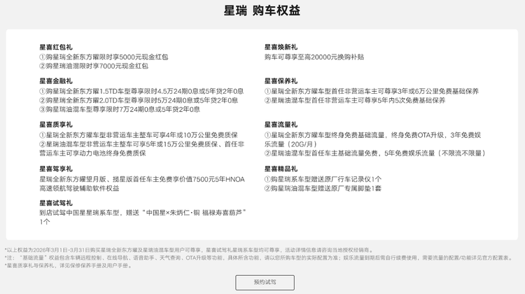 星瑞全新东方曜拥有完善的购车与用车权益,大幅降低购车门槛和后期用车成本,让消费者买得放心、用得省心。购车可享1.5TD车型4.5万24期0息、2.0TD车型5万24期0息的金融优惠,还有至高20000元换购补贴;首任非营运车主可享3年或6万公里免费基础保养,整车4年或10万公里免费质保,还能享受终身免费基础流量、终身免费OTA升级,3年免费娱乐流量,全方位的权益加持,让每一位车主都能尽享高品质用车体验。