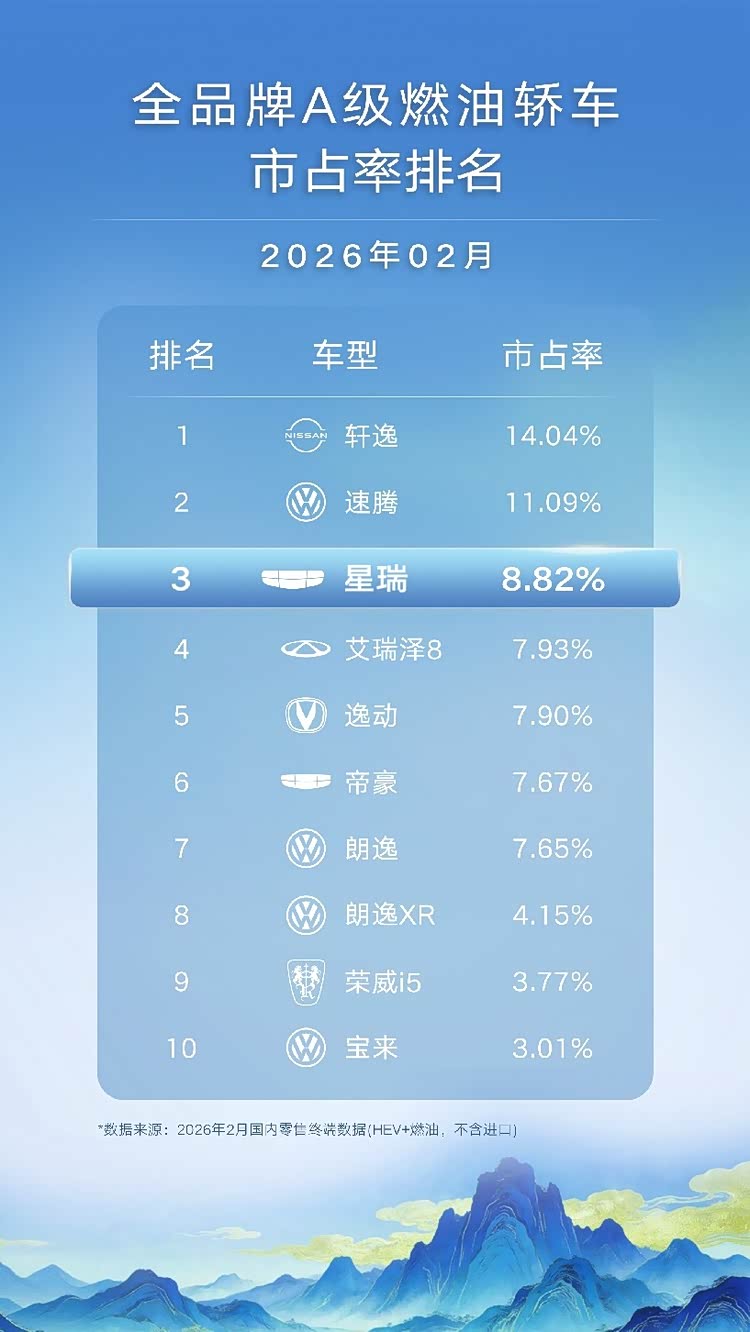 在消费需求不断升级的当下,10万级燃油车市场的竞争愈发激烈,而星瑞全新东方曜始终以硬核实力站稳脚跟,2月斩获13152辆的亮眼销量,牢牢占据中国品牌A级燃油轿车市占率第一的宝座,上市至今超73万用户的认可,让这款车型成为了燃油车市场中名副其实的标杆之作,也让中式豪华与实用性能的融合成为市场新趋势。