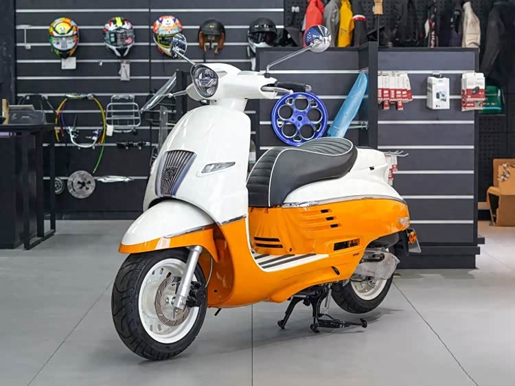 底盘车身采用轻量化钢管车架,兼顾车身刚性与轻量化表现,整备质量仅120kg,操控轻盈灵活,城市穿行、低速挪车十分轻松,适合新手与女性用户。座椅高度780mm,座桶可容纳一顶头盔,平踏板设计带来了充足的脚部空间,也能方便放置大件物品。油箱容量8.5L,综合续航可达400km以上,完全满足日常通勤的储物与续航需求。