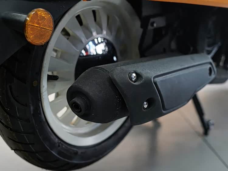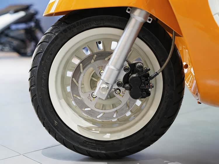 硬件方面,减震系统采用传统伸缩式正立式前叉,行程充足,调校偏向城市通勤的舒适性,搭配侧置单枪后减震,能有效过滤城市道路的细碎颠簸。刹车系统,前轮采用单盘双活塞卡钳,后轮为传统鼓式制动,制动输出线性稳定,维护成本低,制动表现足够应对45km/h时速的日常场景,ABS和TCS自然不会有。