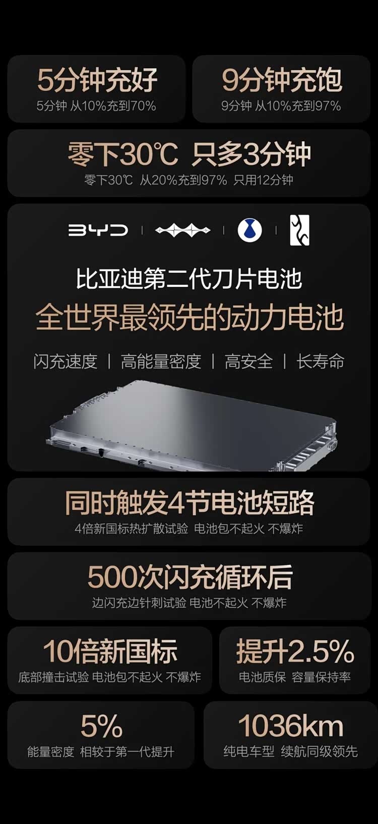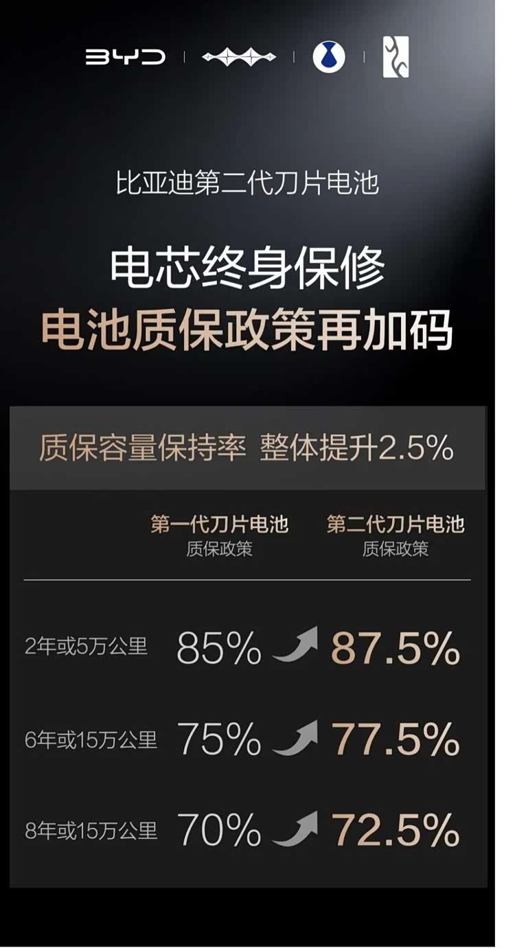 2026年3月5日,比亚迪正式发布第二代刀片电池,凭借“常温5分钟充好、9分钟充饱,零下30度低温仅多3分钟”的闪充表现,硬核破局行业痛点,一举攻克行业“充电慢”“低温充电难”两大痛点,更以高能量密度、长寿命、高安全的全能优势,重新定义全球领先动力电池标准。针对用户普遍关注的“闪充是否影响电池寿命与安全”的核心疑虑,比亚迪第二代刀片电池以创新技术、严苛测试与升级质保给出硬核答案,实现闪充与耐用、安全的完美兼得。充电速度与电池寿命的平衡,一直是动力电池行业的技术难题,大功率闪充产生的热量往往会对电池寿命造成影响。为破解这一矛盾,比亚迪第二代刀片电池打造专属“锂离子高速通道”,并搭载“全温域智能热管理系统”,从源头上减少闪充产热,同时实现热量的快速、均匀散出,从技术层面将闪充对电池寿命的影响降至最低,真正实现“闪充与长寿命兼得”。依托于技术带来的产品底气,比亚迪第二代刀片电池将质保政策全面加码,为用户送上安心保障。相较于第一代刀片电池,第二代产品将质保的「容量保持率」整体提升2.5%,在6年或15万公里质保期内,电池容量低于77.5%即可享受免费包换服务;同时,电芯更是提供「终身保修」权益,以行业领先的质保标准,打消用户的用车顾虑。
