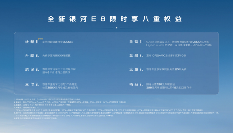对于大多数第一次买纯电车的年轻人来说,选车往往要在预算、品牌、配置、性能之间做取舍。但银河E8的做法是把选择题变成填空题,从入门到顶配,每个版本都有明确的指向性,配置单填得满满当当。年轻人第一台纯电轿跑的门槛,确实被它拉高了不少。