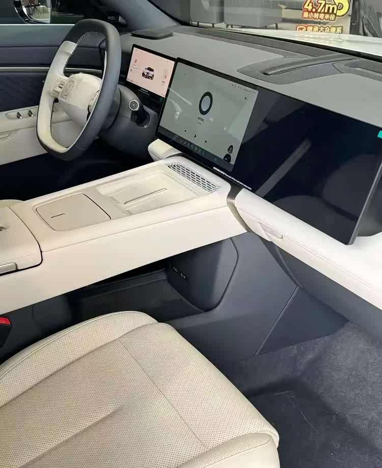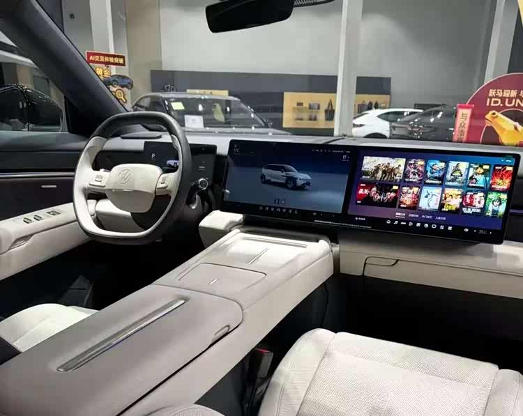 内饰方面,与众08配备全液晶仪表,悬浮式中控屏和副驾娱乐屏组成了一体式大联屏,车机内置高通骁龙8295芯片,支持AI语音助手、场景模式、手机互联和映射等,采用电子怀挡,副仪表台是上下双层结构,下面一层储物空间很大,上面一层有双50瓦手机无线充电面板,扶手箱内部设有空调出风口,实现冰箱效果。