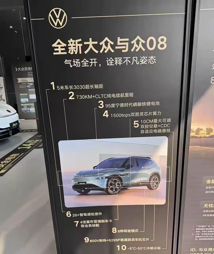 结语:与众08的外观设计个性,尺寸够大,空间宽敞,智能座舱和智驾方面向着新势力品牌看齐,基于800V高压平台,性能和续航方面都达到了同级主流水平,不过实话实说,大众汽车(安徽)的影响力还有待提升,与众08想要被大家认可,必须给出有诚意的售价才行。
