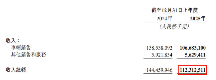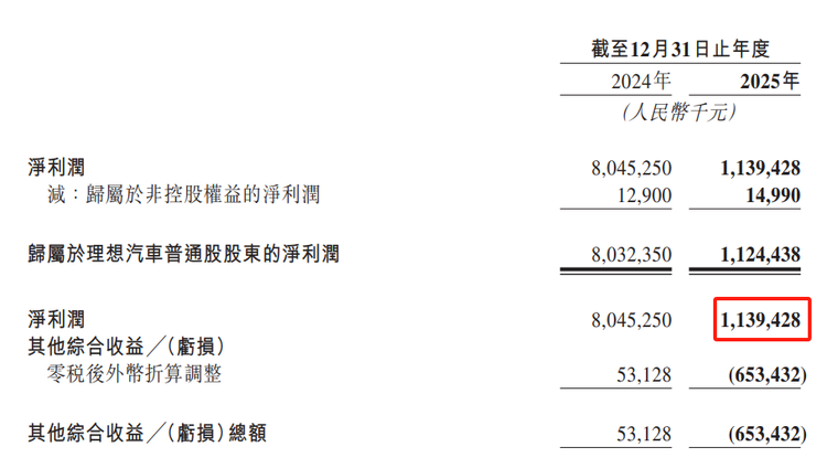 再看全年数据,2025 年理想汽车营收 1123.12 亿元,同比下降 22.3%,虽然营收下滑,但依然破千亿,连续三年保持这个量级,行业头部的位置还在。
