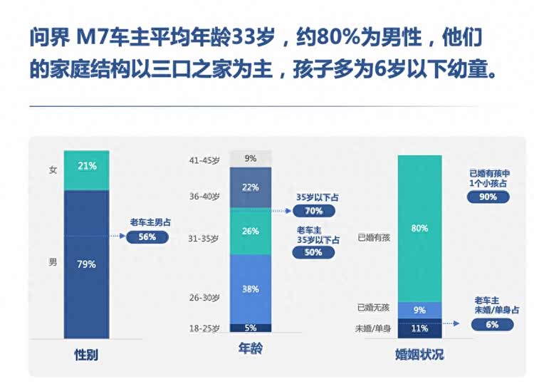 问界M7的车主画像,呈现出鲜明的年轻化、高知化与家庭化特征。调研数据显示,其车主平均年龄33岁,以三口之家为主,孩子多为6岁以下幼童,本科及以上学历占比85%,公司白领与管理层是主力军,具备强劲的消费能力与明确的品质追求。