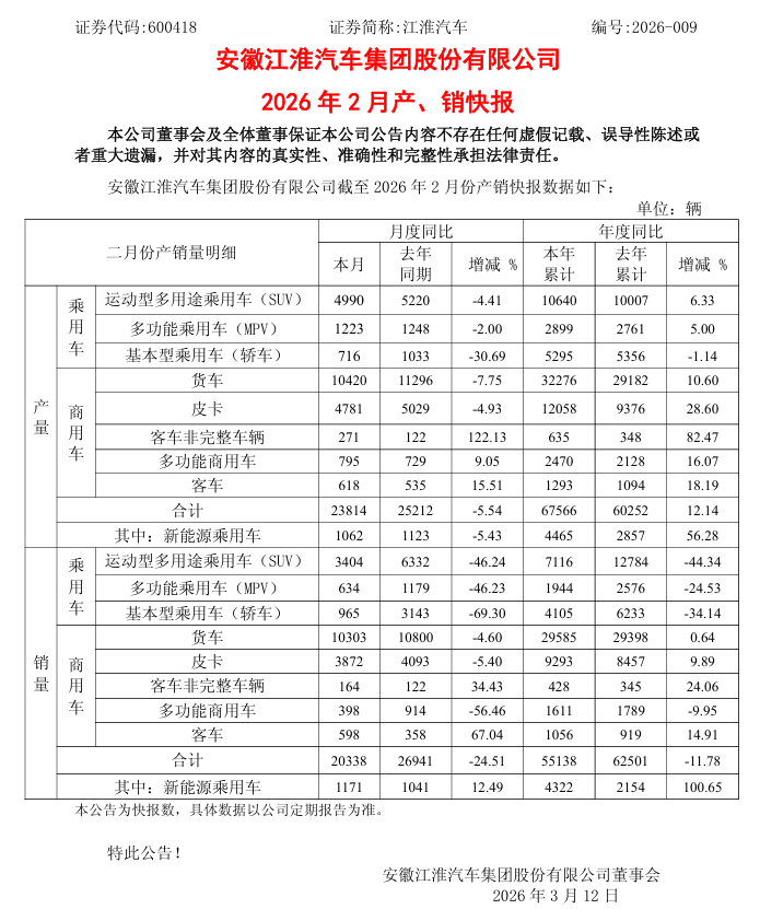 猫头鹰车志(ID:owlauto)讯,据安徽江淮汽车集团股份有限公司(下称“江淮汽车”)发布的2026年2月产销快报,江淮汽车2月整车产量为23814辆,同比下降5.54%;整车销量为20338辆,同比下滑24.51%。江海汽车月度产销同比均出现回落,贴合2月车市传统淡季的市场特征。