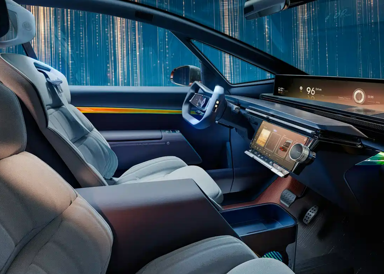 方向盘采用异形手柄式设计,搭配了线控转向技术,主副驾驶位之间未完全阻断,形成了通透的车内空间。座椅造型看起来包裹性很强,后排座椅看着像是由三张独立座椅拼接而成的,即便是中间座位,也能保证良好的乘坐舒适性,兼顾了乘坐体验与实用性。此外,车内配备的三段式全景天幕,视觉效果极佳,能够让车内获得充足的采光。