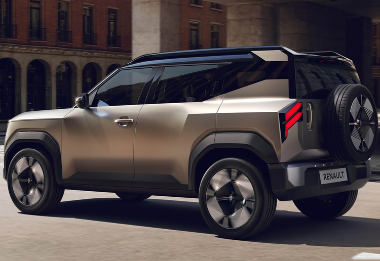 从侧面看,该车造型略带几分起亚EV5的影子,但相比之下,雷诺Bridger Concept的设计更显激进。粗壮的熏黑轮眉与车顶行李架,为车辆赋予了浓郁的跨界气息;前门采用传统门把手设计,后门则配备隐藏式门把手,搭配短促的车身比例,让人联想到路虎卫士的短轴版本。极具设计感的D柱设计,巧妙营造出悬浮式车顶的视觉效果,让方正的车身多了几分灵动。