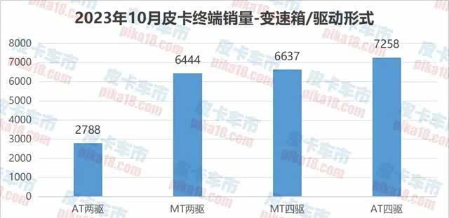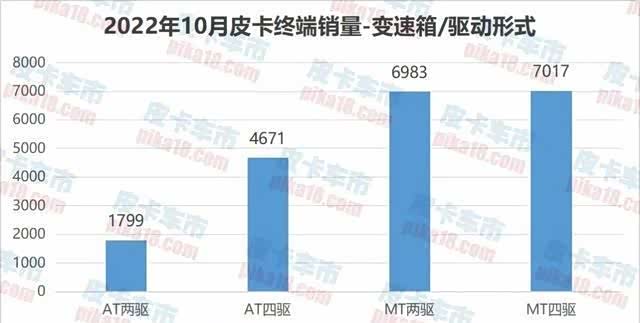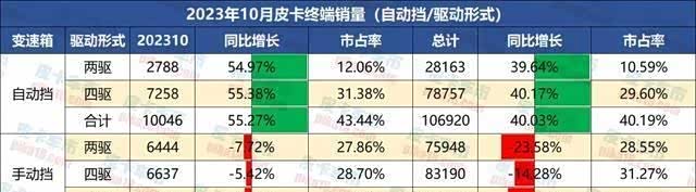 再从自动挡皮卡的驱动形式方面来看,两驱自动挡和四驱自动挡皮卡都有高达50%以上的同比增长,而两驱手动挡和四驱手动挡皮卡的同比全部负增长。1-10月的两驱手动挡和四驱手动挡降幅更加触目惊心。可以看一下去年10月,销量最高的是四驱手动挡皮卡,但是到了今年10月,四驱自动挡皮卡已经成为销量冠军了。