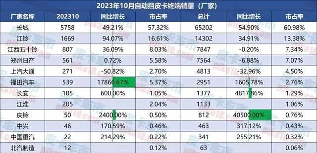 值得一提的是福田皮卡,10月份自动挡皮卡的增长比例高达17866.67%!这也与福田皮卡新上市的火星皮卡息息相关。火星皮卡定位于“全尺寸豪华皮卡”,为品牌向上贡献了主要力量。